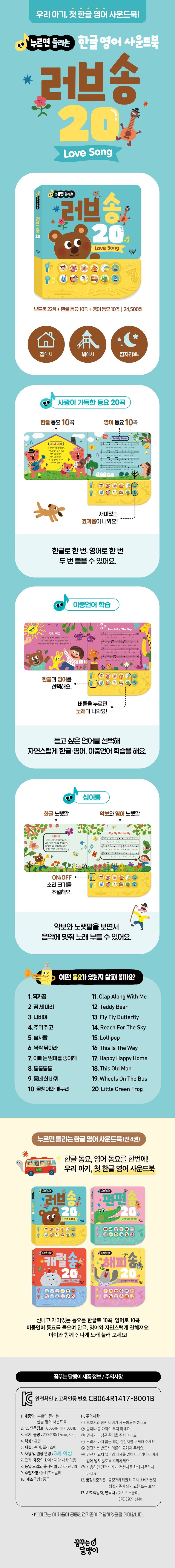 우리 아이들이 좋아하는 신나고 재미있는 인기 동요를 귀여운 일러스트와 악보가 적힌 책을 보면서 한글로 10곡, 영어로 10곡 모두 20곡 들을 수 있어요. 엄마, 아빠, 아기가 함께 신나게 노래 불러요. 간단한 율동도 해 보세요. 아기의 언어 학습과 정서 발달에도 도움이 된답니다.
