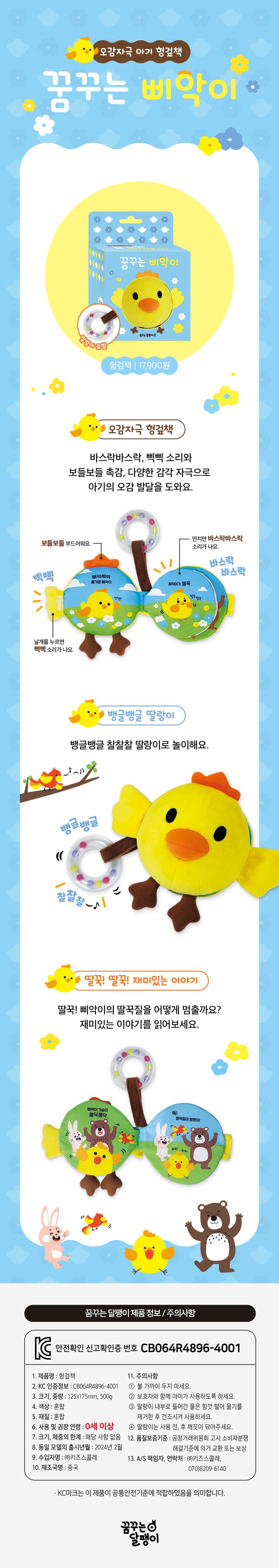 꿈꾸는 삐악이는 앙증맞은 크기, 바스락 삑삑 아기들이 좋아하는 소리와 노란 병아리 모양의 귀여운 헝겊책으로 아기에게 즐거운 시간을 선물해요. 뱅글뱅글 딸랑이도 달려 있어서 아기의 오감을 자극해요!