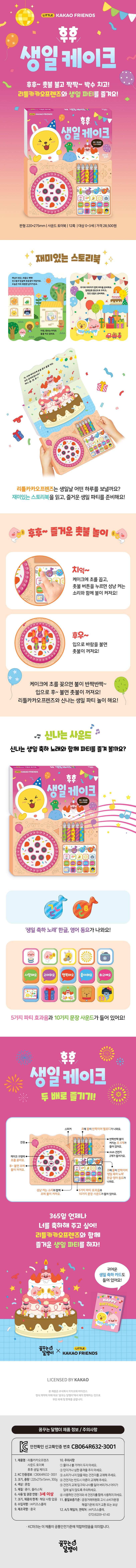 촛불을 켜고 다양한 버튼을 누르며 카카오 리틀프렌즈와 함께 〈후후~ 생일 케이크〉 즐겨 보세요. 잊지 못할 신나는 생일 파티가 될 거예요.