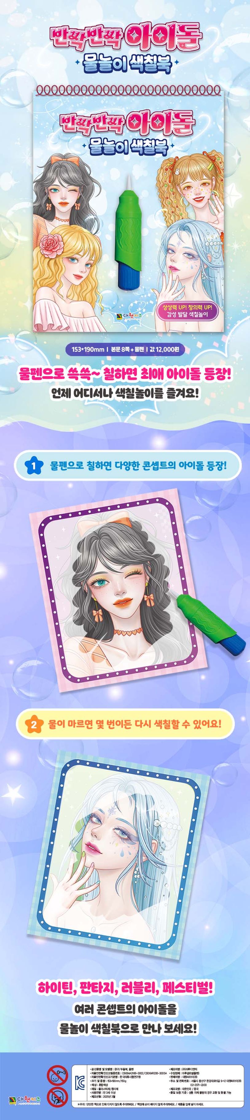 물을 넣은 물펜으로 색칠을 하는 물놀이 색칠북입니다. 하이틴, 판타지, 페스티벌, 러블리! 물펜으로 칠하면 다양한 콘셉트의 아이돌이 등장해요. 물감이 아니고 물이라 옷이나 손이 지저분해질 걱정이 없어요. 또 물이 마르면 얼마든지 반복해서 다시 색칠할 수 있답니다. 스프링으로 책을 묶어 색칠하기도 편해요. 〈반짝반짝 아이돌 물놀이 색칠북〉과 함께 상상력 UP! 창의력 UP! 감성 발달 색칠놀이를 즐겨 보세요.
