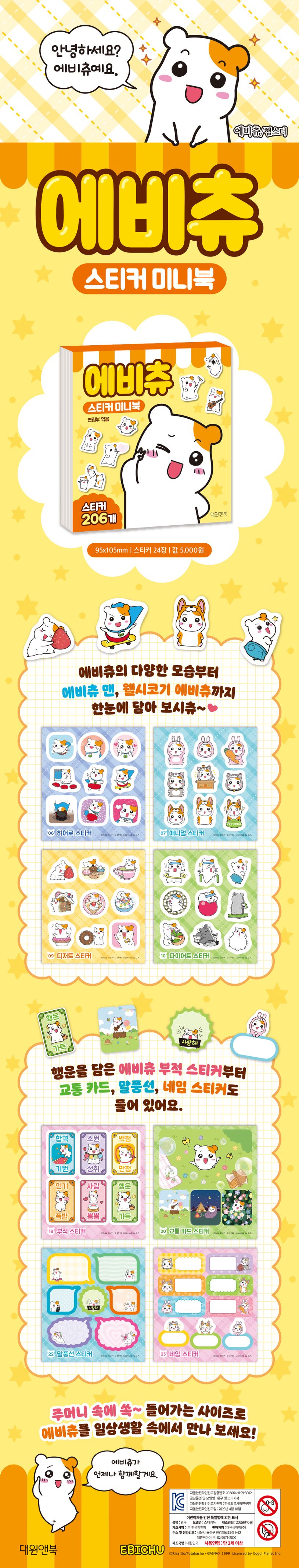 에비츄가스티커미니북으로찾아왔~츄!에비츄의매력을있는그대로담은베이식스티커부터이모티콘,인덱스,말풍선,짤스티커까지!많은사랑을받고있는캐릭터에비츄.에비츄를206개의스티커에가득담았어요.기본스티커부터활용도높은데코스티커까지!에비츄스티커를소중한곳에붙여보세요.부끄러워주저주저하지만여러분을기다리고있는에비츄랍니다!