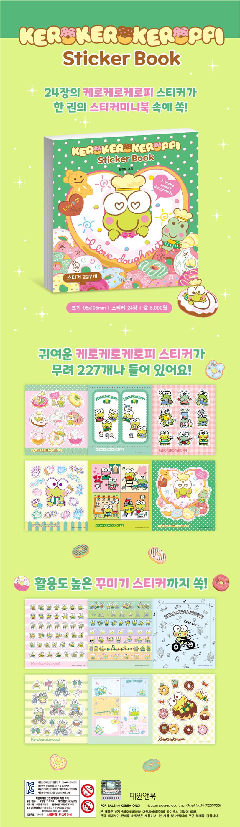 산리오캐릭터즈의 인기 캐릭터 ‘케로케로케로피’의 다양한 테마 스티커가 들어 있는 스티커북입니다. 손바닥보다 조금 큰 미니멀한 크기에 무려 227개의 케로케로케로피 스티커로 구성되어 있어 활용도가 매우 높지요. 다이어리, 노트, 스마트폰 등 원하는 곳에 스티커를 붙이며 일상생활에서 케로케로케로피를 만나 보세요!