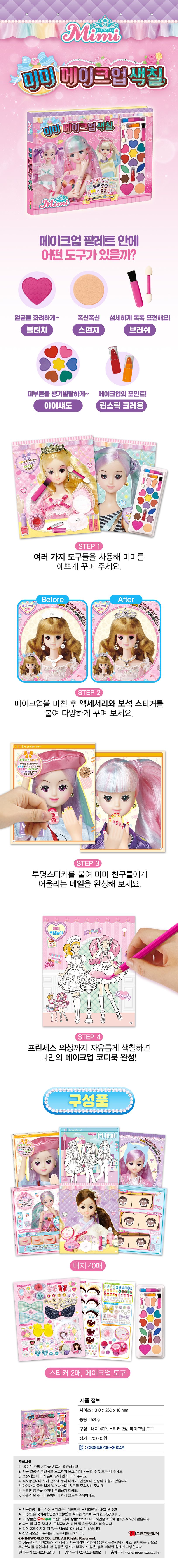 대한민국최초의패션인형미미!1982년에탄생한미미는대한민국최초의패션인형이에요.언제나닮고싶고,함께하고싶은아이들의친구에요!나는야멋진메이크업아티스트!다양한색상의메이크업도구들과블링블링한스티커로미미를예쁘게변신시켜주세요!미미에게나만의스타일로예쁜메이크업을시켜준후블링블링한액세서리스티커로코디할수있습니다.메이크업뿐만아니라네일샵에서는다양한보석과재료들로네일을직접꾸밀수있어아이들에게인기만점!스티커2매는리무벌로붙였다떼었다가가능해서더욱더재미있는스티커놀이를즐길수있습니다.메이크업/스티커/색칠놀이가전부가능한“미미메이크업색칠”을어서빨리만나보세요!*인증유형:안전확인CB064R206-3004A