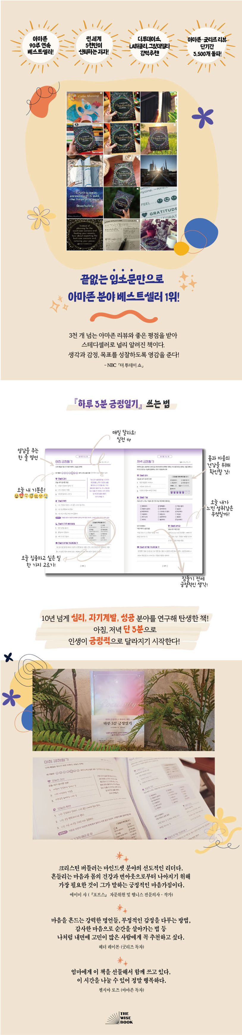 미국에서 자신의 생각, 감정, 목표를 관리하는 일기 형식의 도서 시장은 날이 갈수록 커지고 있다. 하루 단 몇 분의 시간을 내 매일 일기 쓰는 일은 성공한 사람이라면 누구나 반드시 실천하는 습관이기 때문이다. 『하루 3분 긍정일기』의 저자는 전 세계 5,000만 명이 넘는 팔로워를 보유한 커뮤니티 기업 ‘긍정의 힘(The Power of Positivity)’을 이끌며, 긍정적인 마인드셋과 성공에 대해 이야기하고 구체적인 실천법을 알려준다. 그는 자신의 성공 경험을 토대로, 10여 년의 연구와 학습을 통해 인생에 긍정적인 변화와 성공을 가져올 수 있는 특별한 일기를 개발했다. 그리고 직접 출간해 입소문만으로 아마존 90주 연속 베스트셀러, 최단기간 3,500개 이상의 리뷰를 기록해 화제가 되어 다수의 저명 매체에 ‘주목해야 할 자기계발 일기’로 소개되며 뜨거운 사랑을 받고 있다.