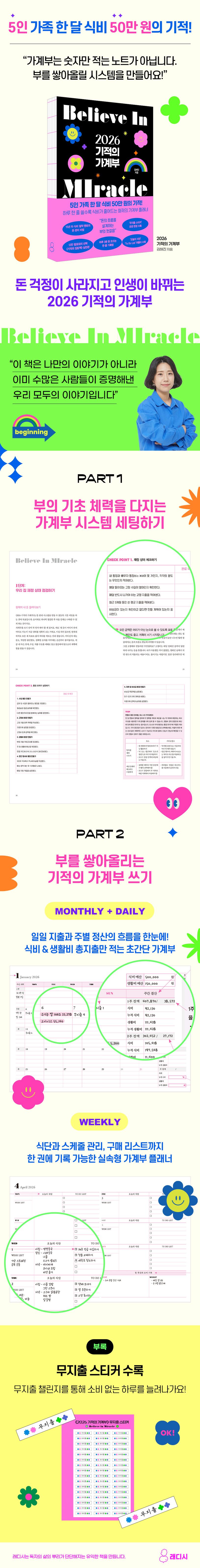 12만 팔로워의 압도적인 지지를 받으며 출간 즉시 1위에 오른 ≪기적의 가계부≫. 쓰기 쉽게 펼칠 수 있는 고급스러운 누드 사철제본 방식을 고수하며, 매년 세련된 디자인을 선보이고 있다. 이번에는 작년 사은품으로 큰 인기를 끌었던 무지출 스티커를 책 속에 부록으로 담았다. 먼슬리 지출칸에 맞게 제작되어 한 달 간 ‘무지출 데이’를 늘리는 것을 목표로 삼을 수 있도록 돕는다.