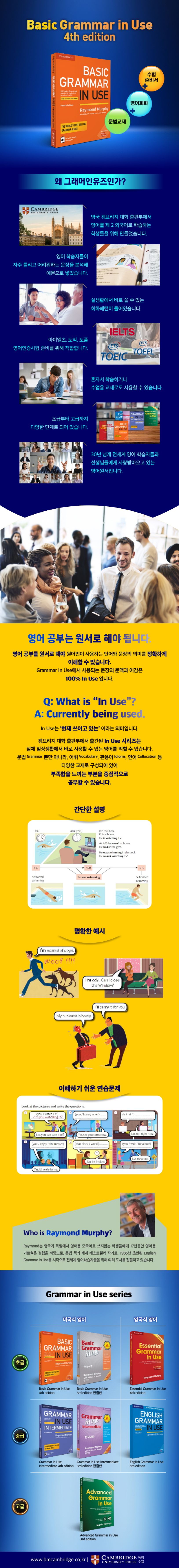 Basic Grammar in Use는 초급 학습자들이 자가학습 및 수업시간에 활용 할 수 있는 베스트셀러 문법책입니다. 명확한 예문들과 연습문제들이 수록된 이 문법책을 통해 초급 학습자들은 자신의 수준에 필요한 모든 문법영역을 학습할 수 있습니다.