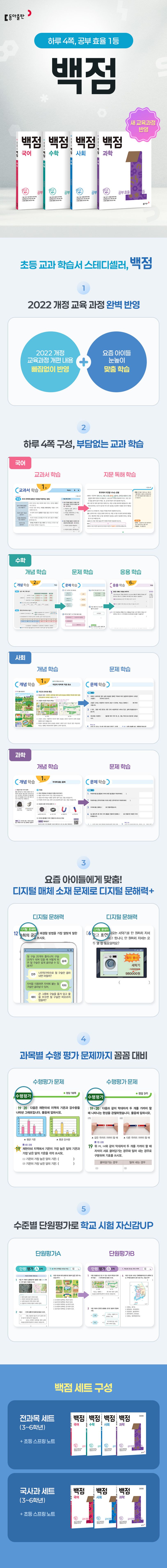 [개념북]자기주도학습을위한"하루4쪽"구성-(개념학습+문제학습)핵심개념과개념확인예제로개념을쉽게이해하고,핵심유형문제와서술형연습문제,디지털문해력문제를해결하며실력을쌓을수있습니다.-(응용학습)응용유형의문제를단계별해결순서와문제해결TIP을이용하여해결하며응용력을높일수있습니다.-(마무리평가)한단원을마무리하며실력을점검하고,수행평가문제로학교수행평가에대비할수있습니다.[평가북]맞춤형평가대비수준별단원평가-단원별학습성취도를확인하고,학교단원평가에대비할수있는수준별(A단계/B단계)단원평가와1학기를마무리하는총정리개념으로구성하였습니다.