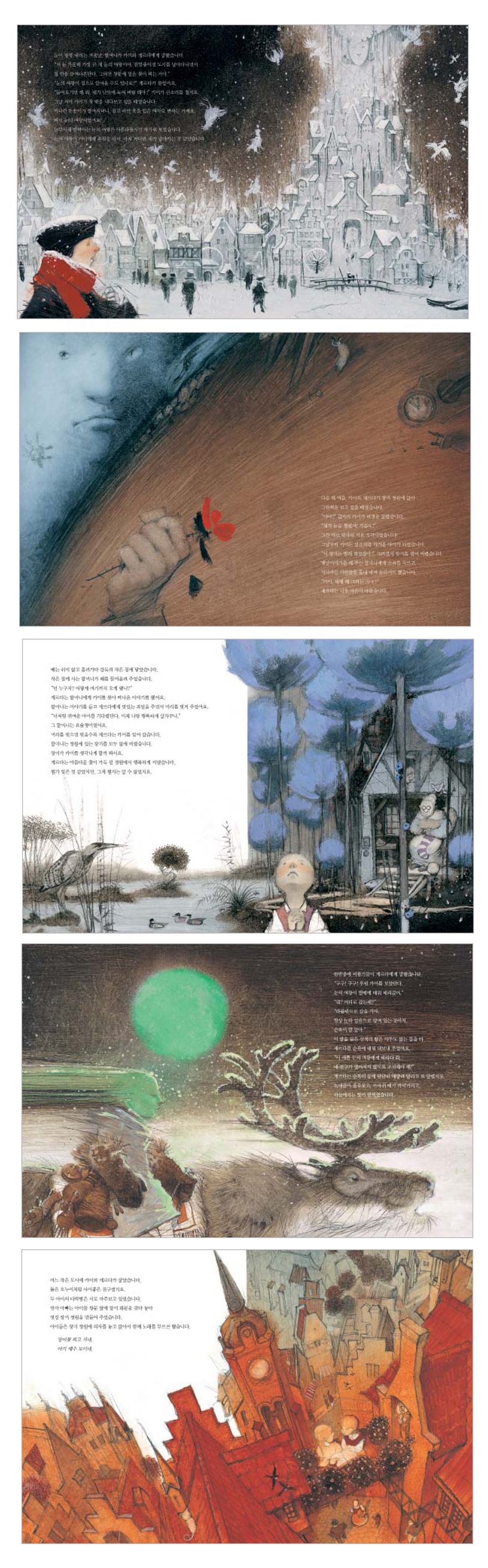 <눈의 여왕> 이야기 중 게르다가 카이를 찾기 위한 과정은 마치 서사시처럼 장대하게 펼쳐진다. 이 동화는 인간을 죄에 빠지게 하는 악마의 거울 조각과 그것에서 구원해 주는 붉은 장미꽃의 상징을 통해, 죄에서 인간을 구원해 주는 기독교적 메세지를 내포한다. 이외에도 비유와 상징이 곳곳에 녹아 있는 수준 높은 작품이다. 특히, 이야기에 들어가기 앞서 악마의 거울 조각의 탄생 배경을 설명하고 있다. 게다가 이야기에 생명력을 불어 넣은 환상적인 그림으로 그려진 삽화는 읽는 아이들을 슬그머니 상상의 나라로 데려간다. 상징이 돋보이는 이야기와 그림이 돋보이는 그림책.