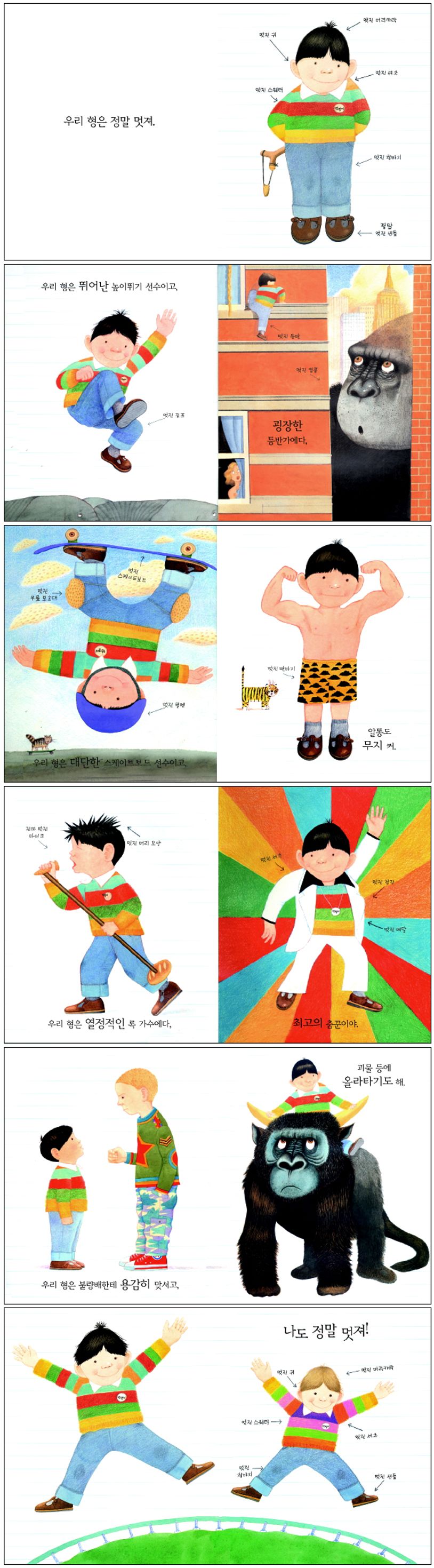 이 세상의 모든 형제자매들은 매일같이 투닥거리며 싸울 것입니다. 이 그림책에서는 그런 모습을 찾을 수가 없습니다. 약간 허풍이 있긴 하지만 형을 대단히 자랑스러워하는 동생만이 있습니다. 읽는 독자는 그런 모습 속에서 형 혹은 동생에게 갖는 내적인 갈등과 불안감을 속 시원하게 해소할 수 있습니다.