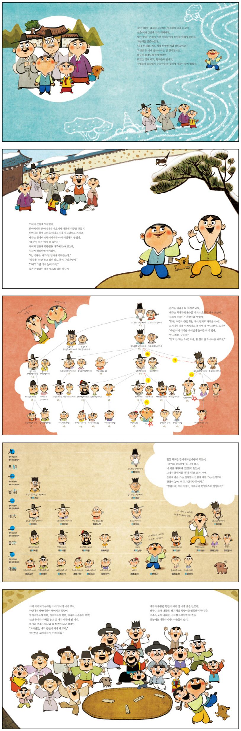 『동갑인데 세배를 왜 해』는 가족 한 사람 한 사람의 이름, 호칭, 촌수를 재미있게 익힐 수 있는 그림책이다. 아이들은 이제껏 나와 엄마, 아빠뿐이라고 생각했던 가족이라는 범위를 더 크게 넓히며, ‘나’라는 존재가 조상으로부터 내려왔고, 같은 피가 흐르는 친척들이 있으며, 가족이라는 울타리 안에서 자신의 위치가 어디쯤인지 생각해 보는 기회를 가질 수 있다. 또한 섣달그믐날부터 설날 저녁까지 1박2일 동안의 풍성한 옛날 설 풍속을 만날 수 있다.
