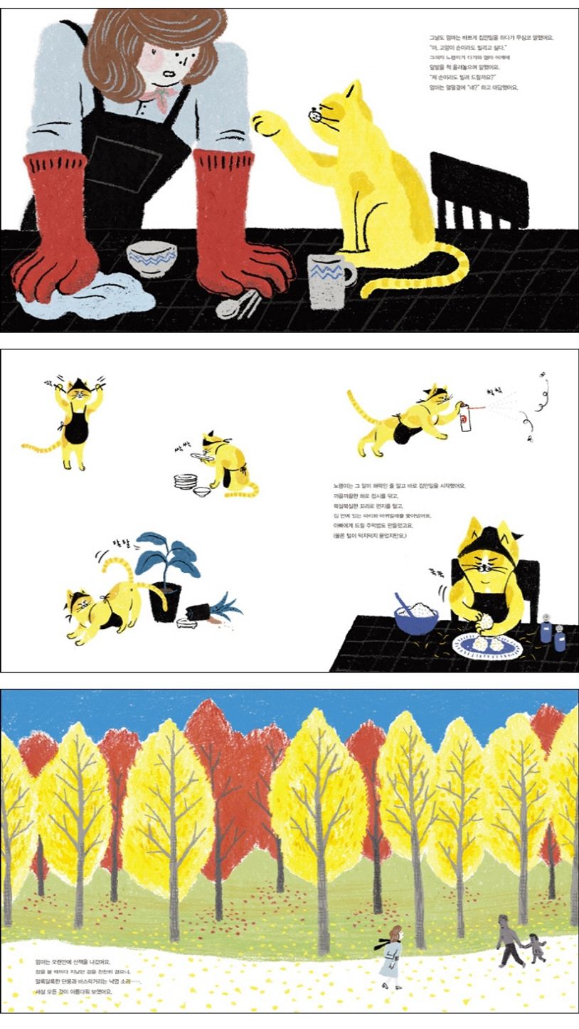 '고양이 손이라도 빌리고 싶다'는 속담이 있습니다. 정신 없이 바쁠 때는 작은 도움이라도 요긴하다는 의미일 텐데, 『고양이 손을 빌려 드립니다』에서는 일상에 지친 엄마의 한숨 끝에 진짜 고양이가 천연덕스럽게 자기 손이라도 보태겠다고 나섭니다. 그야말로 푸훗, 웃음이 나오면서 ‘고양이가 정말 집안일을 도와준다면 어떤 식일까?’ 상상을 하게 되지요. 까끌까끌한 혀로 접시를 닦고 북실북실한 꼬리로 먼지를 털고 아빠 드릴 주먹밥도 털 손으로 야무지게 만드는 앙증맞은 고양이 노랭이. 이쯤 되니 이야기만 들어도 작은 고양이가 엄마 대신 종종거리며 집 안을 오가는 모습이 눈에 선합니다.