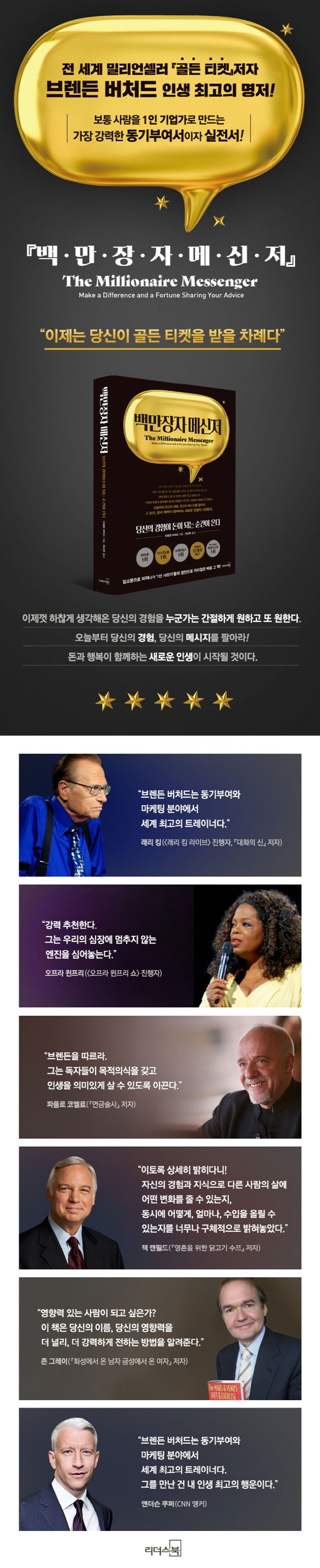 중고서점 대란을 일으킨 『메신저가 되라』가 『백만장자 메신저』라는 제목으로 출간되었다. 이 책은 제목 그대로 ‘백만장자 메신저’가 되는 법이다. 자신의 ‘경험과 지식’을 ‘메시지’로 만들어 다른 사람을 도우면서 돈을 버는 1인 기업가의 세계로 안내한다. 세 아이를 키운 엄마는 초등학교 입학 상담사가 되고, 자동차 좋아하는 누군가는 중고차 컨설턴트가 된다. 책 좋아하는 동료는 기업교육 전문 북큐레이터가 되고, 퇴사한 금융회사 직원은 개인 자산관리사로 돈을 번다. 시간제 노동자가 아닌 일의 ‘가치’에 따라 돈을 벌기에 ‘돈과 행복과 자유’가 있는 새로운 인생을 살 수 있다.