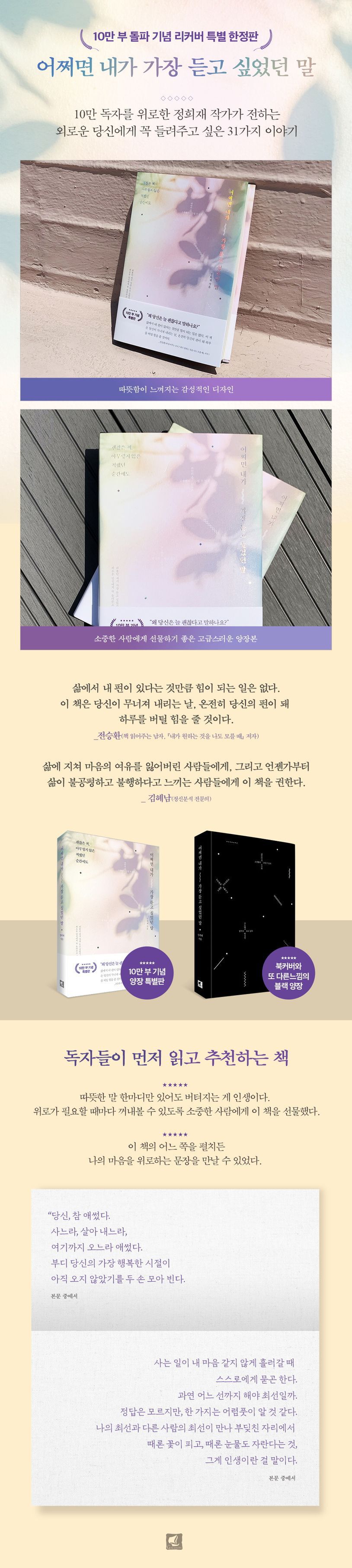 2017년 출간 후 국내 독자들에게 꾸준히 사랑받으며 스테디셀러가 된 《어쩌면 내가 가장 듣고 싶었던 말》이 10만 부를 기념하여 새롭게 디자인 되었다.