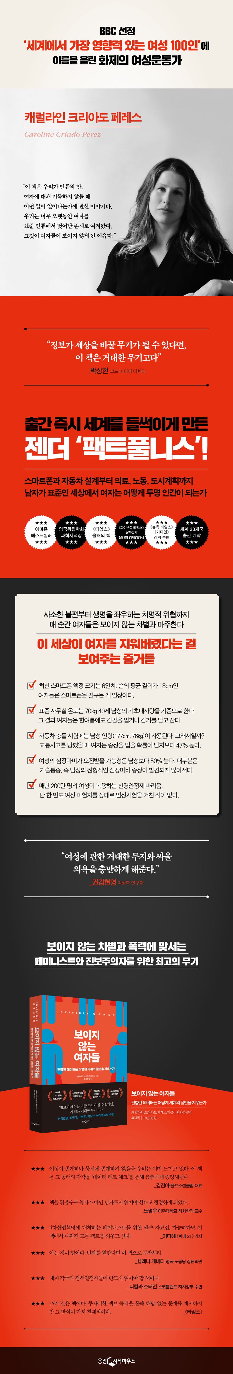 영국에서 가장 주목받는 여성운동가이자 저널리스트인 저자는 기술과 노동, 의료, 도시계획, 경제, 정치, 재난 상황 등 16가지 영역에 걸쳐 여성에 관한 데이터 공백이 우리의 삶에 미치는 영향과 차별의 단면을 면밀하게 보여준다. 그간 은폐되고 누락되었던 여성의 관점과 지식을 복원하는 것이 남녀 모두, 나아가 세상에 어떤 이득이 되는지 시사한다. 방대한 통계 자료와 풍성한 사례들을 바탕으로 한 이 책은 젠더를 둘러싼 끊임없는 논쟁과 잘못된 편견을 불식시키는 동시에, 보다 합리적이고 평등한 사회로 나아가기 위한 무기를 제공할 것이다.