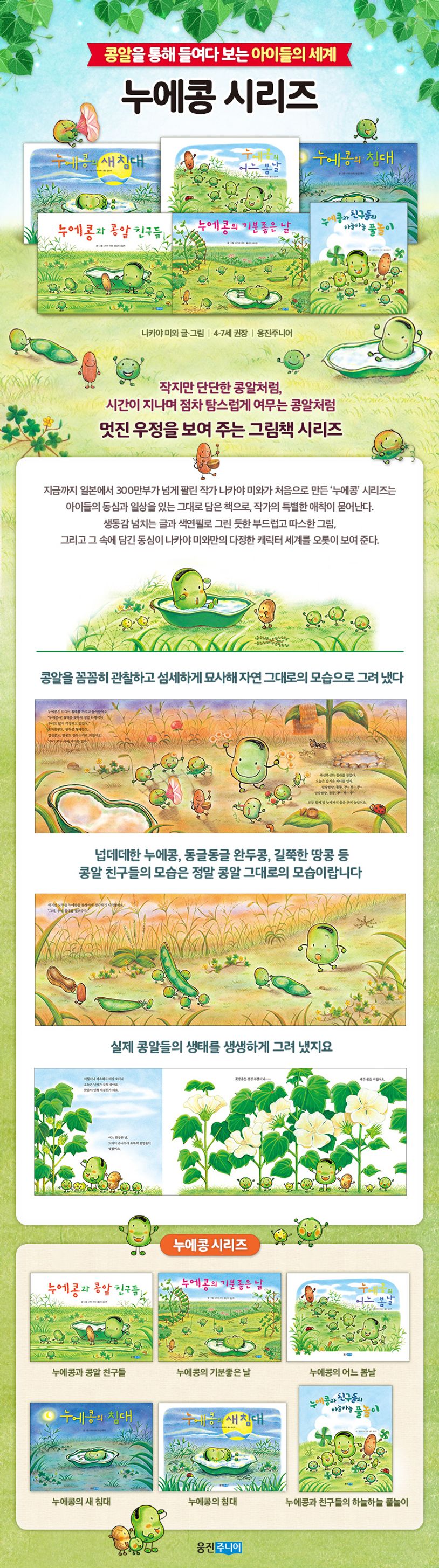 누에콩 시리즈는 작가가 콩알을 꼼꼼히 관찰하고 섬세하게 묘사해 자연 그대로의 모습으로 그려 내었다는 점에서 더욱 유명합니다. 넙데데한 누에콩, 동글동글 완두콩, 길쭉한 땅콩 등 콩알 친구들의 모습은 정말 콩알 그대로의 모습이랍니다. 이러한 작가의 세심한 관찰은 책을 보는 아이들도 자연에 대해 한층 관심을 갖게 됩니다. 어른들은 본인의 어린 시절로 돌아가 자연 속에서 겪었던 즐거운 추억을 떠올리게 되고요. 자연을 가만히 들여다 볼 때의 새로운 즐거움을 선물하는 이야기입니다.