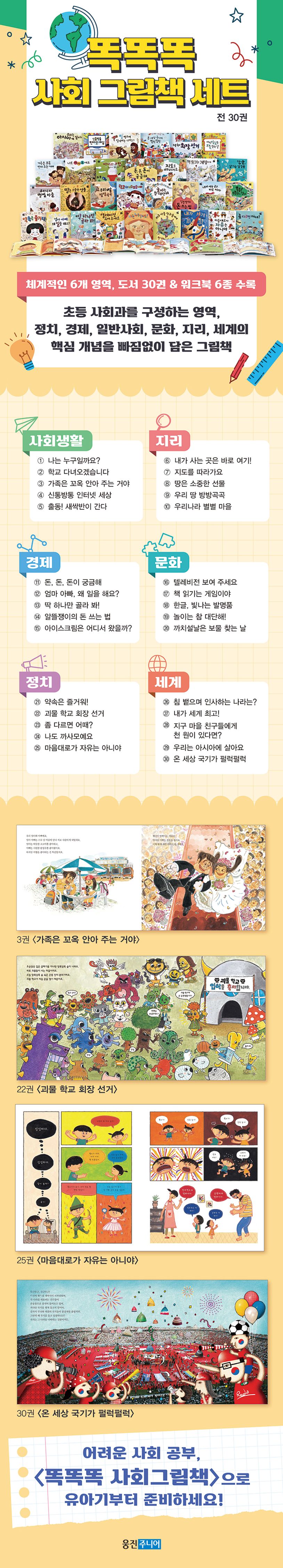 초등 사회과를 구성하는 6개 영역, 정치, 경제, 일반사회, 문화, 지리, 세계의 핵심 개념을 빠짐없이 담았다. 각 영역별로 5권씩 총 30권 구성이다.