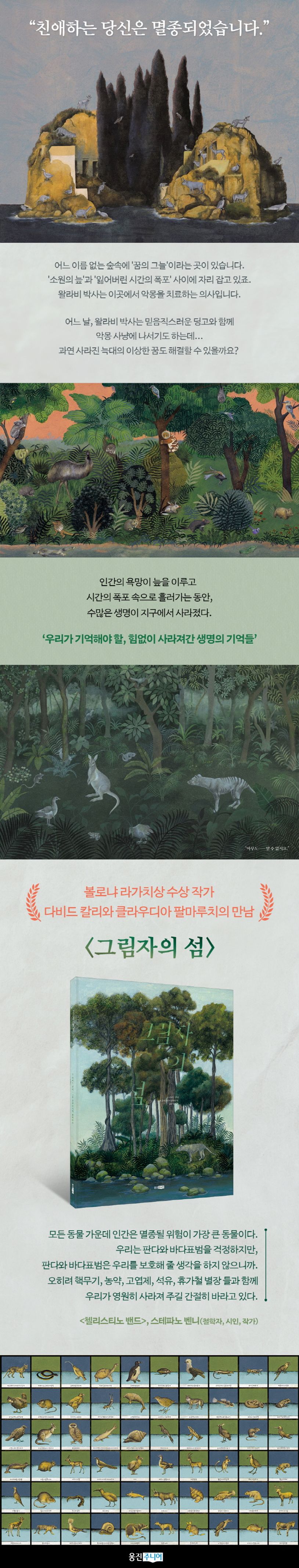 어느 이름 없는 숲속, ‘소원의 늪’과 ‘잃어버린 시간의 폭포’ 사이에 ‘꿈의 그늘’이 있다. 왈라비 박사는 이곳에서 숲속 동물들을 치료하고 상담하는 의사다. 특히 악몽을 치료하는 꿈 전문가, 이른바 악몽 사냥꾼이다. 오늘도 꿈의 그늘에 환자들이 잔뜩 모여들었다. 가시두더지는 거대한 발에 짓밟히는 꿈을 꾸었고, 에뮤는 밤새 누군가에게 쫓기는 꿈을 꿨다. 코알라는 항상 이상한 소리에 잠 못 이룬다. 숲에 무슨 일이 일어나고 있는 걸까? 왈라비 박사는 믿음직스러운 딩고, 시리오와 함께 악몽을 찾아 나서기로 한다. 〈그림자의 섬〉은 이상한 꿈에 시달리는 동물들의 아득하고 기묘한 이야기를 담은 그림책이다. 악몽을 추적하는 왈라비 박사의 여정이 꿈과 현실의 경계를 넘나들며 신비롭게 펼쳐진다. 우리가 기억해야 할, 힘없이 사라져간 생명의 기억들이 촘촘하게 박혀 있는 작품이다.
