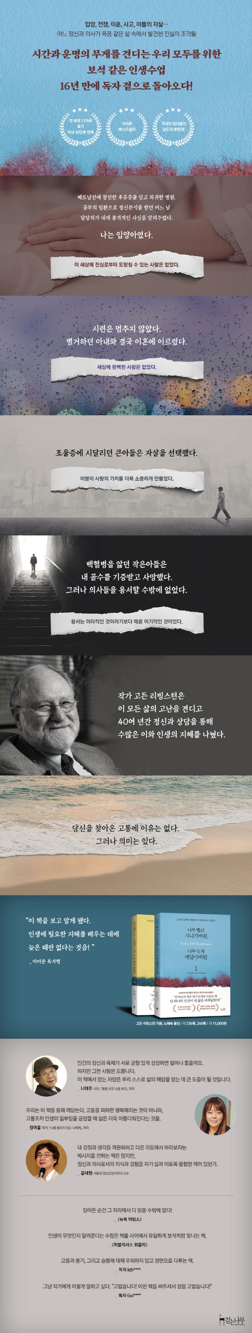 고든 리빙스턴은 40여 년의 긴 세월 동안 심리 치료사이자 정신과 의사로서 삶의 고통에 힘겨워하는 수많은 사람들을 상담해왔다. 또 그는 자기 자신이 입양, 전쟁, 이혼, 두 아들의 죽음 등을 겪은 험난한 삶의 당사자이기도 하다. 인생의 고통에 힘들어하는 사람들에게 필요한 조언을 해주다 보니 후회 없는 인생을 위한 지혜가 조금씩 보이기 시작했다. 그것을 자신의 개인적인 경험과 함께 정리한 결과물이 바로 이 책 『너무 빨리 지나가버린, 너무 늦게 깨달아버린 1·2』이다.