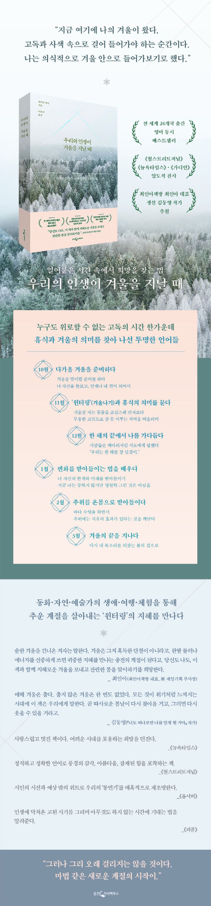 다시 찾아온 겨울의 초입에 선 우리 모두가 읽어야 할 에세이가 도착했다. “글로 이루어진 치료제”(가디언), “정직하고 정확한 언어로 풍경의 감각, 아름다움, 잠재된 힘을 포착하는 책”(월스트리트저널)이라는 극찬을 받은 『우리의 인생이 겨울을 지날 때』가 바로 그것이다.