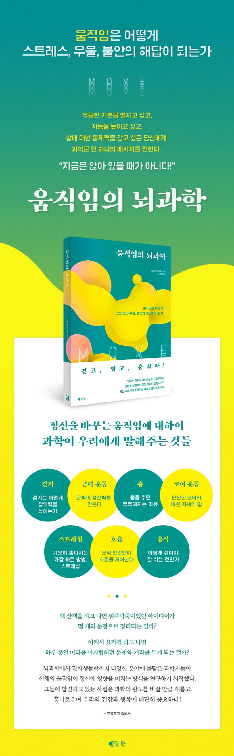 왜 산책을 하고 나면 뒤죽박죽이었던 아이디어가 몇 개의 문장으로 정리되는 걸까? 어째서 요가를 하고 나면 하루 종일 머리를 어지럽히던 걱정거리와 거리를 두게 되는 걸까? 부엌에서 음악에 맞춰 몸을 흔들고 나면 기분이 좋은 이유는 무엇일까? 뇌과학에서 진화생물학까지 다양한 분야에 몸담은 과학자들이 신체의 움직임이 정신에 영향을 미치는 방식을 연구하기 시작했다. 그들이 발견하고 있는 사실은 과학의 판도를 바꿀 만큼 새롭고 흥미로우며 우리의 건강과 행복에 대단히 중요하다.