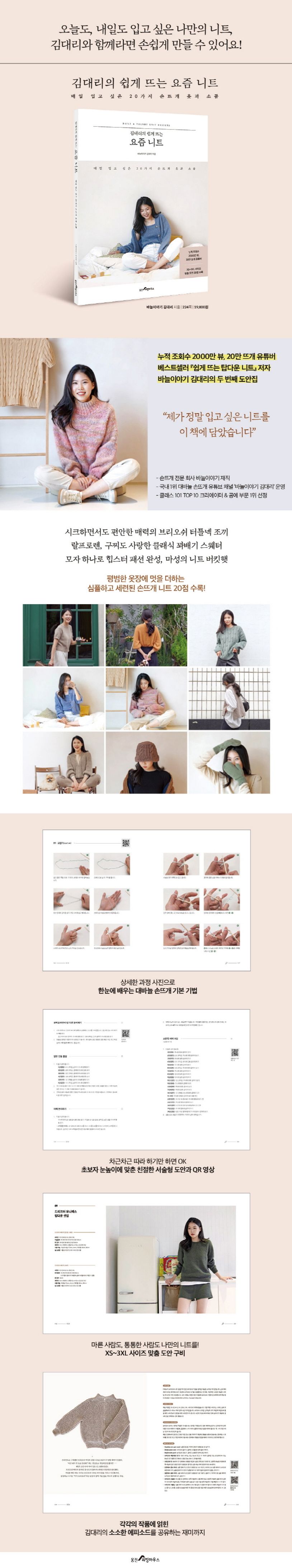 수많은 독자들을 손뜨개 니트의 세계로 안내했던 『쉽게 뜨는 탑다운 니트』의 저자 ‘바늘이야기 김대리’가 더욱 트렌디하고 풍성해진 두 번째 도안집 『김대리의 쉽게 뜨는 요즘 니트』로 돌아왔다. 22만 구독자들과 소통하는 인기 유튜버이자 밀레니얼 세대 손뜨개 작가답게, 이번 책에는 김대리의 젊은 감각이 돋보이는 데일리 니트 작품 20점을 수록했다. 카디건과 스웨터, 조끼 같은 옷을 비롯해 모자, 목도리, 장갑, 양말로 구성된 소품까지 아우르고 있어, 각자의 취향과 필요에 따라 원하는 니트를 골라 도전하게 해준다.