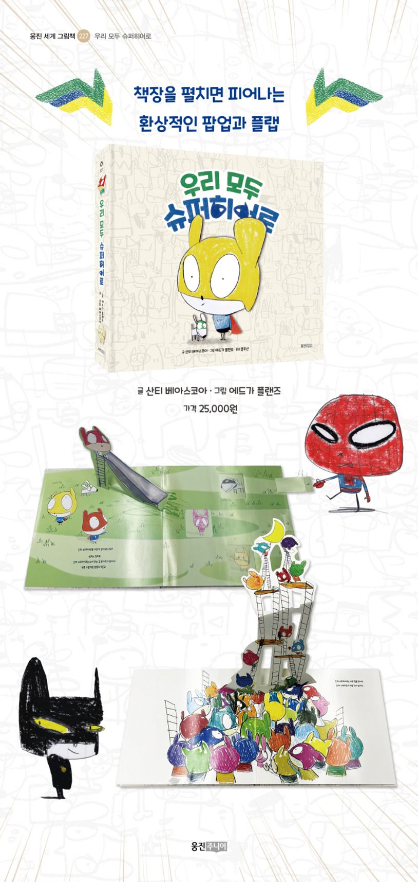 슈퍼히어로에 푹 빠져 있는 아이에게 “슈퍼히어로가 진짜 있다는 걸 알고 있나요?”라는 목소리가 들립니다. 아이는 곧바로 슈퍼히어로를 찾아 나섭니다. 그러나 아무리 살펴보아도 광선을 쏘거나 하늘을 나는 슈퍼히어로는 보이지 않아요. 우리 곁에 살고 있는 슈퍼히어로는 과연 누구일까요? 팝업이 열리는 순간 상상도 할 수 없었던 ‘진짜 슈퍼히어로’의 모습을 발견할 수 있을 거예요!