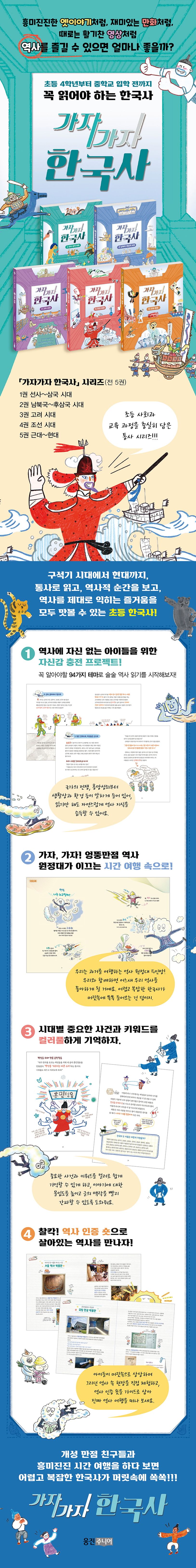 〈가자가자한국사〉는이런바람에서시작되었습니다.〈가자가자한국사〉는역사책을‘읽는’즐거움,역사적순간들을‘보는’즐거움,역사를제대로‘익히는’즐거움을모두맛볼수있는통사시리즈로,우리역사에서꼭기억해야할94가지테마를선정해5권에알차게담았습니다.이테마안에는국가간의전쟁,흥망성쇠부터범인들의생활상과환경등이알차게들어있어,역사를관계와흐름안에서이해하는너른시각을갖게합니다.특히각시대별전문가인강종훈,정요근,허태구,홍종욱교수의꼼꼼한감수에힘입어,어린이독자의눈높이에맞추면서도역사적사실에대한세밀한검증까지거친,재미있고실속있는역사시리즈가탄생할수있었습니다.