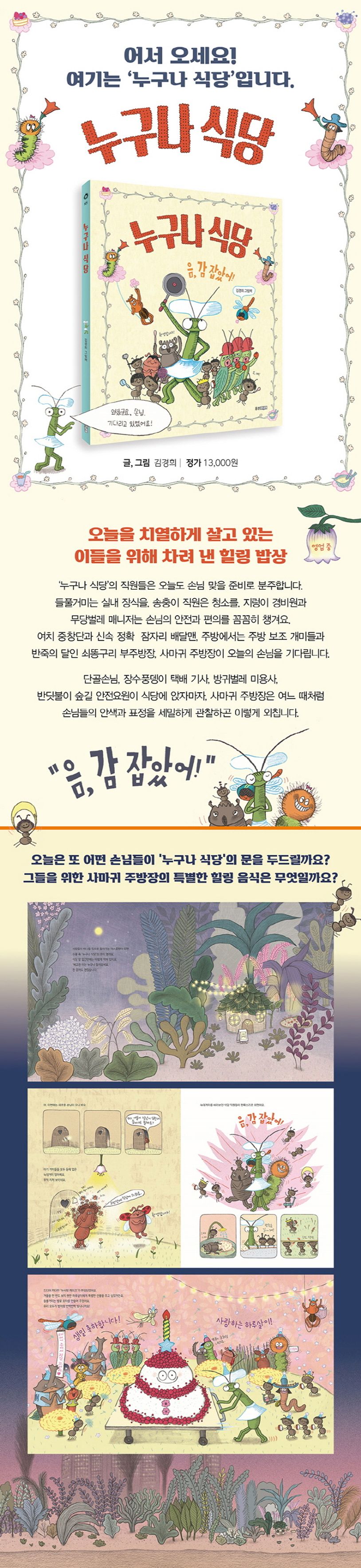 오늘을치열하게살고있는이들을위해차려낸힐링밥상『누구나식당』에는각양각색의곤충들이등장합니다.날카로운앞발을자유자재로사용할수있는사마귀는대체불가멋쟁이주방장을,‘치르치르’우는여치는식당중창단을,재빠른날갯짓을자랑하는잠자리는배달기사를맡았습니다.또힘세기로유명한장수풍뎅이는택배기사,반짝반짝빛을발하는반딧불이는숲길안전요원,새끼들을모두업고다니는늑대거미는육아에지친엄마손님으로식당을찾게됩니다.각등장인물의상황과곤충의생태학적특성이연결되어,인물과이야기가한층더입체적이고생동감있게다가옵니다.김경희작가는주변에서흔히마주치는사람들의모습을곤충의특징과매칭해표현했습니다.특히,느릿느릿움직이지만위기의순간에기지를발휘해문제를해결하는자벌레에작가자신의모습을투영해,독자로하여금숨어있는이야기를한겹씩열어보는재미도숨겨놓았지요.사마귀주방장과‘누구나식당’직원들이손님을위한힐링음식을만들고대접했듯,작가의정성이그득담긴『누구나식당』또한쉼과위로를주는특별한음식같은그림책입니다.작고평범한존재들이이뤄가는‘소중한세계’를담은그림책딱열가닥머리카락만있어도언제나긍정적인‘괜찮아아저씨’,용기의진정한의미를찾아가는진정한히어로‘용기맨’,바보스러울만큼착해거짓말에속지만결국선한마음씨로복을받는숯장수.모두김경희작가의그림책속주인공들입니다.주인공이라내세우기엔대단한능력하나없는지극히평범한인물들이지만,작가는이들의밝고건강한마음이사람들의마음,더나아가세상을어떻게물들이는지에주목해왔지요.『누구나식당』에서도작가는작은곤충들이각자맡은일에최선을다하는모습을장면마다세밀하게표현했습니다.자기자리에서묵묵히일하는이들의일상이전하는아름다움과그가치의소중함을고이담았습니다.만약『누구나식당』의주방장이라면,누구를위해,어떤음식을만들어주고싶은가요?『누구나식당』의손님으로방문한다면,어떤음식을대접받고싶은가요?*인증유형:공급자적합성확인