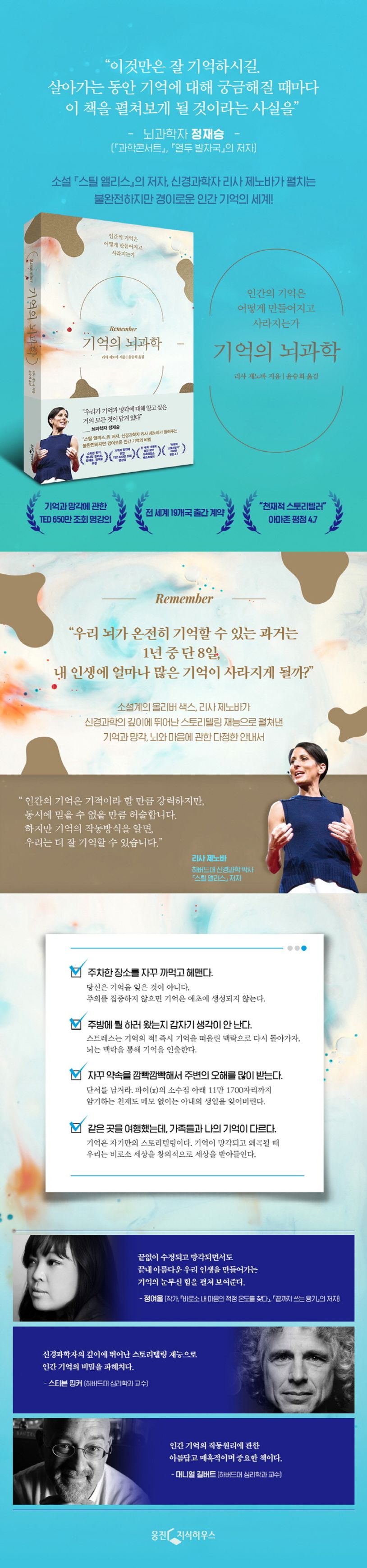 이에제노바는일상적인건망증은알츠하이머병의징후와구분해야하며,나아가기억이어떻게저장되고지워지는지원리를알면그러한두려움에서해방되어더나은기억생활을할수있다고강조한다.자신의첫논픽션저서인신간『기억의뇌과학』에서그는신경과학자의전문성과뛰어난스토리텔링능력을바탕으로불완전하지만경이로운인간기억의세계로우리를안내한다.이책에따르면인간의뇌는모든것을기억하고저장하도록설계되지않았으며,망각은우리가피해야할질병이아니라진화에따른지극히정상적인상태이다.나아가기억이란우리가기억한것과잊어버린것의총합이라고새롭게정의한다.
