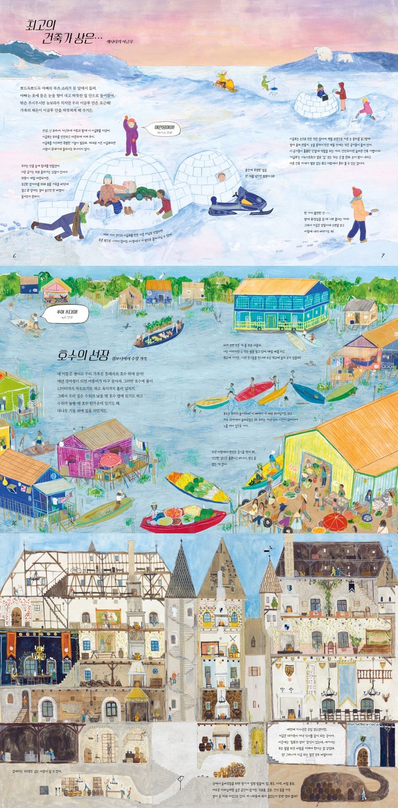 『세상의 모든 집으로』는 캄보디아부터 네덜란드, 몽골 등 전 세계의 특색 있는 집들을 소개한다. 눈으로 만든 집 이글루, 물 위를 떠다니는 집 보트 하우스, 땅속에 지어 비밀 요새 같은 토굴집까지 다양한 형태의 집을 섬세하고 밀도 높은 그림과 함께 만나볼 수 있다.