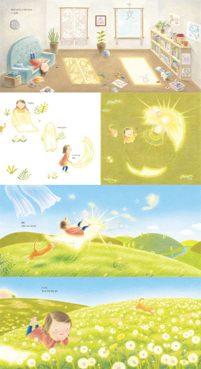 ‘어느날,바닥에비친햇빛조각을가만히보다가,그햇빛을들어덮고싶다는생각이들었어요.그렇게계속바라보다보니,미세하게햇빛이움직이는것이보였어요.그리고‘그림자놀이를하듯,햇빛놀이를한다면어떨까?’라는상상을더해봤어요.이그림책은이렇게‘바라보기’에서시작되었어요.’_작가의말중에서눈부신햇빛이연출해낸서정적인상상놀이의세계“아,심심해.”아이의간절한외침이아이를둘러싼공간과시간을바꿔놓은걸까요?놀이매트의나비가살아움직이고식물이줄기를일으켜꽃을피우고물고기가허공으로튀어오릅니다.평범하고건조하게만보였던방이아이가마음껏뛰놀수있는자유의공간이자,새,물고기같은친구들로가득한놀이의공간이되었습니다.이제아이는이불을휘릭펼쳐타고폐쇄된거실을벗어나높이높이하늘을날며바람의세기와향기를만끽합니다.한껏의기소침해있던아이의어깨가즐거움에들썩이는게움직임없는그림에서도느껴질정도로말이에요.『햇빛놀이』는아이의상상속세계를빔프로젝터로한장면,한장면천천히넘겨보며어둠과빛이만나연출하는환상적인여운을연상하게하는,아름다운그림책입니다.사소하고익숙한것들을새롭게보는시선에대하여아이가맛보았던해방감,즐거움은오직꿈이라는가상의공간에서만가능했던걸까요?아이가잠에서깨어남과동시에아이를보듬던이야기들도제자리로돌아갈준비를합니다.“내일또만나!”아이의얼굴에또혼자가될내일의시간들에대한기대감이피어납니다.작가는이모든경험들이꿈속에서만가능한게아니라고,무심히지나칠수있는일상의작은것,너무익숙해져서더이상바라보지않는것에서도우리를일으키고즐겁게하는수많은이야기를발견할수있다고이야기합니다.마음에힘이되는그림책을짓고싶다는작가의바람처럼,『햇빛놀이』에는외롭고억눌린마음도날개를달고훨훨날수있기를응원하는마음이가득담겨있습니다.*인증유형:공급자적합성확인
