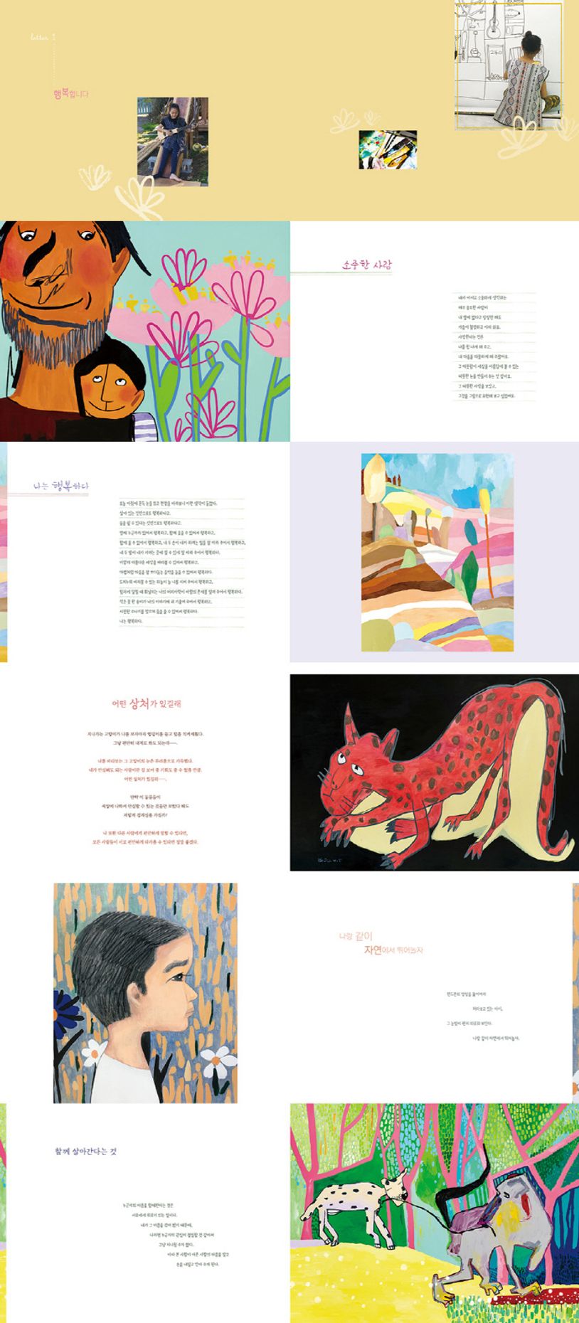 전이수 작가는 행복하다. 제주에 사는 게 마냥 즐겁고, 뭐든 편안하게 할 수 있는 집이 있어서, 소중한 사람이 곁에 있어 힘이 난다. 두 손과 두 발이 아름다운 세상을 느낄 수 있어서, 시원한 소나기를 맞으며 마음껏 춤출 수 있어서, 힘겨워하는 이에게 작은 어깨라도 빌려줄 수 있어서 행복하다. 찬바람에도 아랑곳하지 않고 반팔 티셔츠 차림으로 동생들과 마당을 뜀박질하며 웃는 얼굴에서, 나무에 기대어 기타를 튕기며 노래에 심취하는 모습에서, 자기 키보다도 훨씬 큰 벽에 서슴없이 물감을 입히는 손길에서 ‘나는 행복하다.’는 고백이 힘 있게 메아리친다.