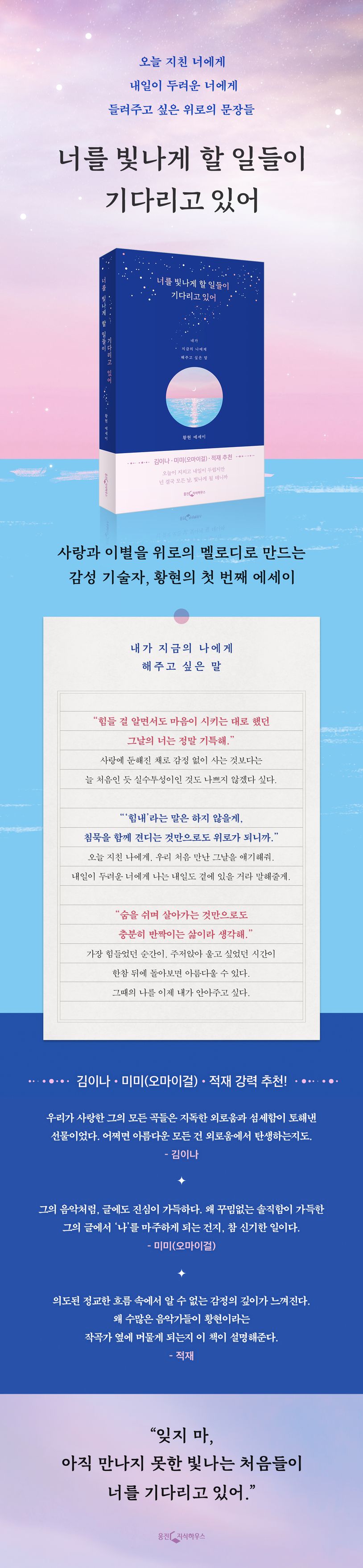 그는 말한다. 때때로 불안하고, 자주 외롭고, 가끔 기쁘다면 제대로 살고 있는 것이라고. 아프거나, 외롭거나, 슬프더라도 살아 숨 쉬는 당신은 지금 이 순간에도 빛나고 있다고. 그의 첫 번째 에세이 〈너를 빛나게 할 일들이 기다리고 있어〉는 그렇게 오늘 빛나고 있고, 내일 더 빛날 당신을 응원한다.