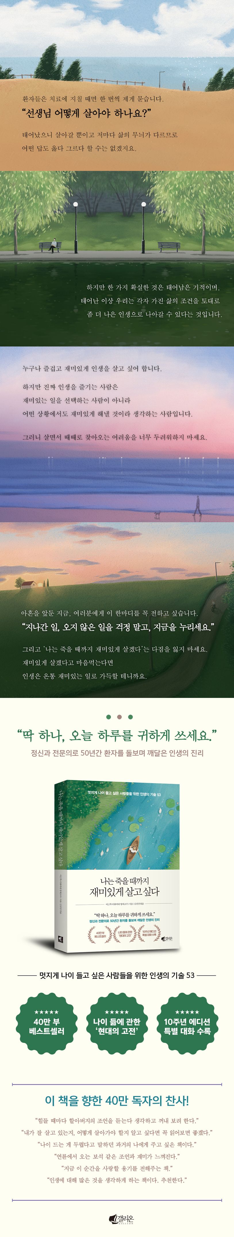 우리 삶을 관통하는 화두인 ‘어떻게 살 것인가’에 대한 실마리를 제시하며 2013년 출간 당시 독자들의 큰 호응을 얻어 베스트셀러가 되었고, 이후 10년 넘게 40만 부가 판매되며 나이 듦에 관한 ‘현대의 고전’으로 자리 잡은 책이 있다. 바로 《나는 죽을 때까지 재미있게 살고 싶다》이다. 특히 이 책은 ‘부모님에게 선물하고 싶은 책’으로 손꼽히는데, “우리 부모님도 이렇게 유쾌하게 나이 들었으면 좋겠다”, “책 사는 게 돈 아깝다던 엄마가 직접 서점에 가서 구입한 책이다” 등과 같은 독자평이 줄을 이었다. 이 책은 여전히 인생의 방황기에 답을 얻고 싶은 사람들, 노년을 준비하는 사람들을 위한 다양한 콘텐츠에 끊임없이 회자되고 있다,