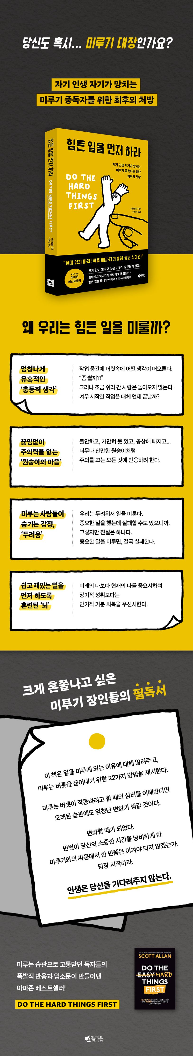 이 책은 자기계발서 베스트셀러 저자 스콧 앨런의 대표작으로 미루는 습관과 싸우는 독자들의 폭발적 지지를 받은 책이다. 저자 본인도 30년간 미루기 버릇으로 고통받아 왔으며 그 습관으로 인해 인생 내내 심각한 손해를 입으며 살아왔다. 저자는 자신이 미루기라는 고질병을 고쳤던 방법들을 소개하며 미루는 사람들은 게으른 것이 아니라 습관 형성이 잘못되었을 뿐이라고 말한다. 새로운 습관을 쌓기 위한 저자의 현실밀착형 조언은 당신이 나쁜 버릇을 끊어내고 힘든 일부터 먼저 처리하는 새로운 습관을 만들 수 있도록 도와줄 것이다.