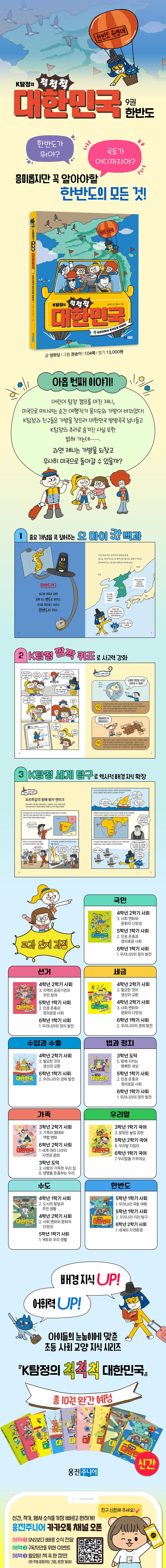 〈K탐정의 척척척 대한민국〉 시리즈 아홉 번째 이야기 『한반도에서 옹지도를 찾아라!』에서는 한반도와 국토의 개념, DMZ의 역사와 의미, 백두 대간과 동고서저 지형, 갯벌의 가치와 보존, 세계 자연유산 등을 소개한다. 뉴 K탐정과 함께 한반도 지리의 모든 것을 알아보자.