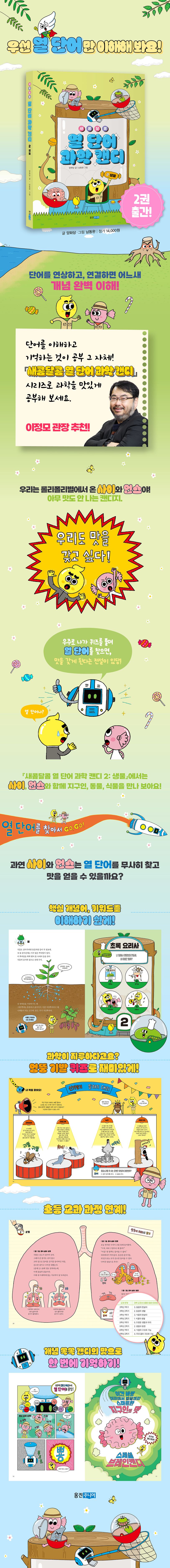 2권 〈생물〉 편에서는 싸이와 언스가 지구에서 만난 지구인, 동물, 식물을 살펴봅니다. 방귀를 뿡뿡 뀌고 온몸에 털이 가득한 지구인은 신기하기만 해요. 땅 위, 하늘, 바닷속에서 포유류, 조류, 어류 등 동물들도 구경하며 열 단어를 찾는데…. 흠! 이건 무슨 향기죠? 알록달록 꽃과 키 큰 나무가 자라는 숲에서 무시무시한 사냥꾼 식물을 만났어요! 싸이와 언스는 열 단어를 찾아 무사히 과학 캔디의 맛을 얻을 수 있을까요?
