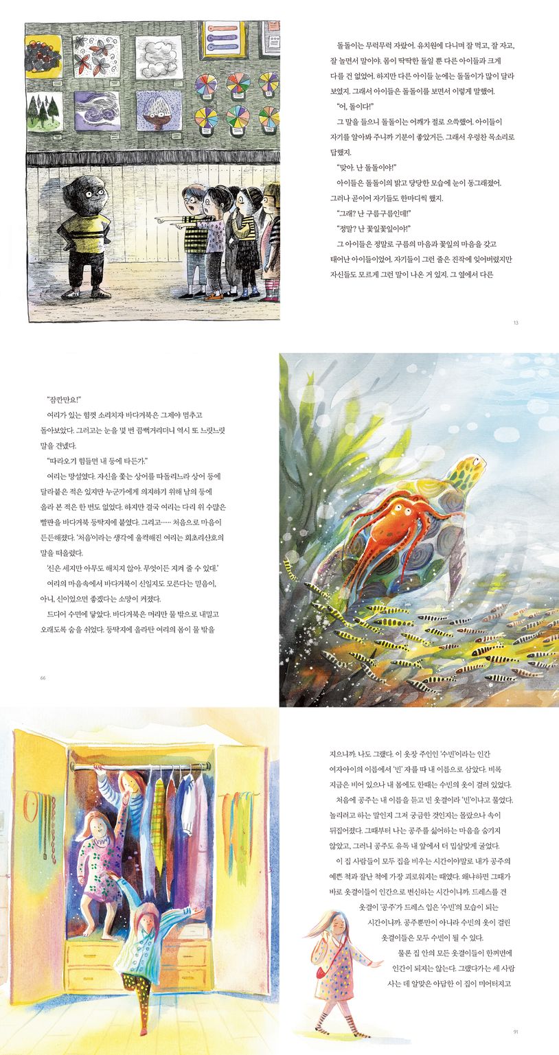 단단한 돌 피부로 태어난 아이 ‘돌돌이’, 여린 몸으로 태어나 자신이 왜 이리 힘겨운 삶을 살아야 하는지 고민하는 문어 ‘여리’, 평범한 옷걸이 인간들과는 생각이 다른 옷걸이 ‘빈’까지. 주인공들은 스스로 고민하며 자신이 누구인지 깨달아 간다.