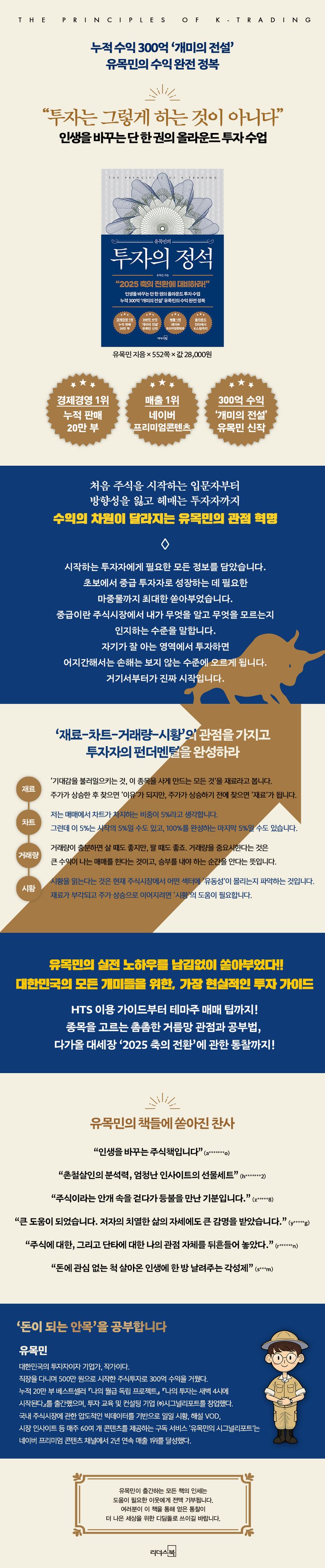 제목 그대로, 모든 개미 투자자를 위한 ‘정석책’을 쓰기 위해 저자는 자신의 투자 노하우와 통찰을 모두 쏟아부었다. 주식과 시장에 관한 ‘기본 지식’부터 실전에서 갈고 닦은 ‘수익 감각’까지, 폭넓은 구성과 상세한 설명으로써 초보 단계의 투자자가 중급으로 올라설 수 있는 데 필요한 마중물을 최대한 담아냈다.