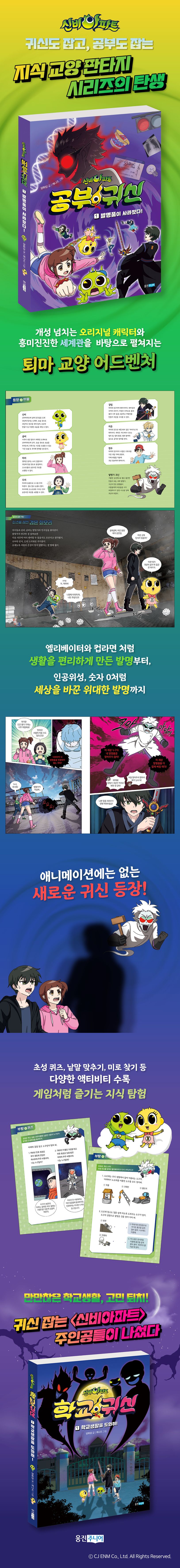 두 자릿수 시청률을 넘기고 뮤지컬과 게임 등 수많은 파생 콘텐츠가 만들어질 만큼 어린이들의 ‘최애’ 애니메이션으로 굳건히 자리 잡은 〈신비아파트〉. 귀신보다 공부하는 게 더 무시무시한 어린이들에게 공부의 재미를 알려 주기 위해 〈신비아파트 공부 귀신〉 시리즈로 다시 태어났다! 개성 넘치는 오리지널 캐릭터들과 흥미진진한 세계관은 그대로 담아내되, 신나게 귀신 소탕 작전을 펼치는 이야기 속에서 자연스레 유익한 교양 지식을 얻을 수 있도록 구성했다.