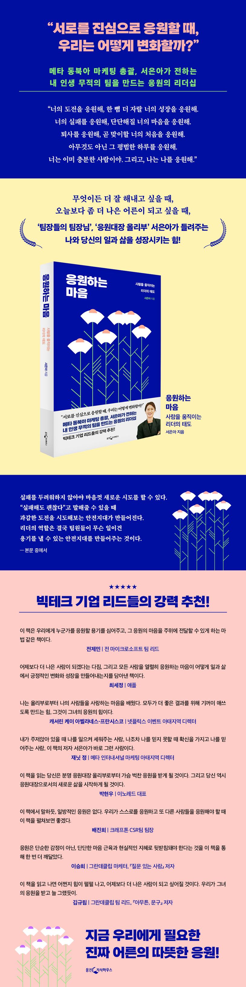 글로벌조직에서저자가보여주는리더십은단순한응원을넘어서사람들의내적동기부여와외적지지를동시에이끌어낸다.어제보다조금더나은사람이되겠다는다짐,그리고모든사람을열렬히응원하는그마음이어떻게우리모두의일과삶에서긍정적인변화와성장을만들어내는지를담아낸책이다.이책을통해독자들도따뜻하고영향력있는리더가되는변화를경험할수있을것이다.