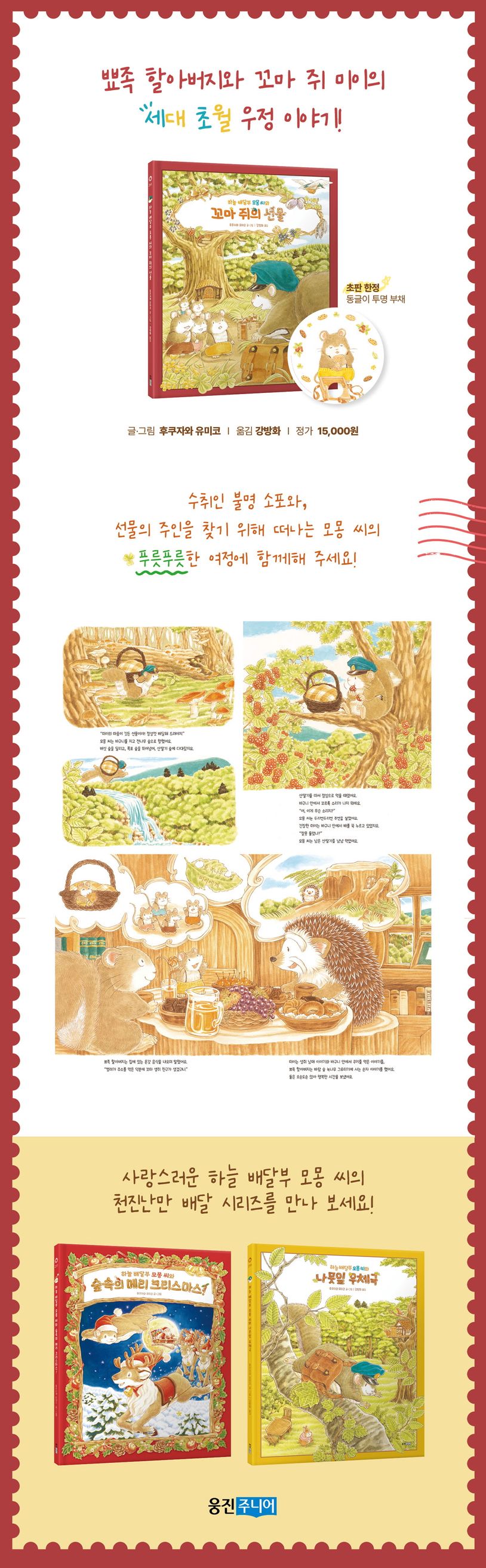 하늘 배달부 모몽 씨는 도토리 숲의 배달부다. 어느 날, 호수 숲의 배달부 해오라기 씨가 수취인 불명의 소포를 가지고 모몽 씨를 찾아왔다. 벌레가 나뭇잎에 적어 놓은 주소를 먹은 바람에 어느 숲에 사는지 모를 ‘미이’를 찾으러 왔다는데…….