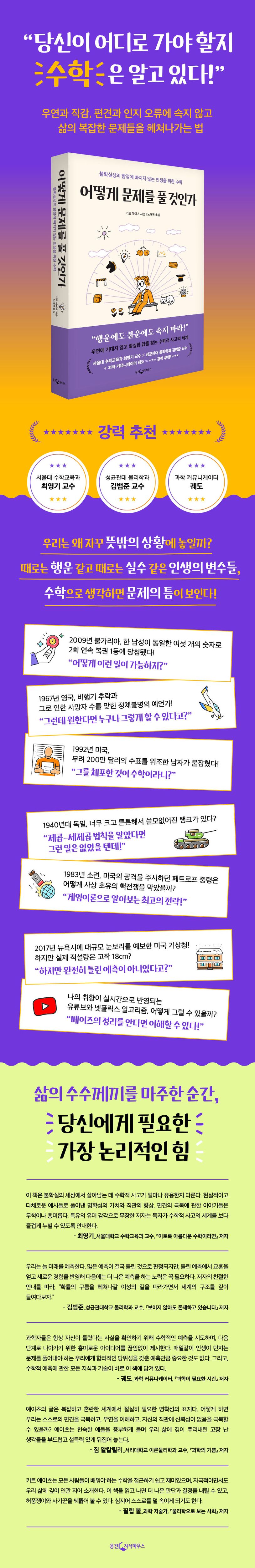 특유의 위트로 무장한 수학자의 외침을 부디 외면하지 않길 바란다. 여러분의 생각 구조에 수학이 끼어드는 순간, 우연 혹은 운이라고 넘겼던 삶의 조각들이 논리적으로 이해되는 새로운 경험을 하게 될 것이다. 그리고 그 경험은 우리가 인생의 방향을 보다 올바르게 잡는 데 중요한 기준이 되어줄 것이다.