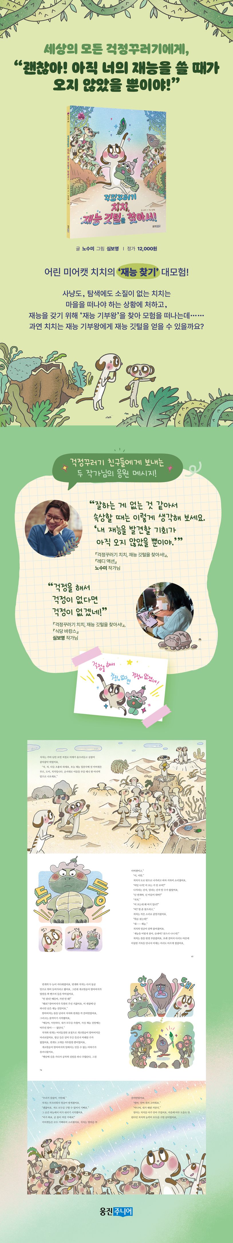 재능이 있어야만 제 역할을 받을 수 있는 미어캣 마을. 그러나 어린 미어캣 ‘치치’는 사냥도, 탐색에도 아무 재능이 없다! 재능이 없다면 마을을 떠나야 하는 카야 님의 법칙에 따라, 치치는 재능을 갖기 위해 ‘재능 기부왕’을 찾아 모험을 떠나는데……. 과연 치치는 재능 기부왕에게서 재능 깃털을 얻을 수 있을까?