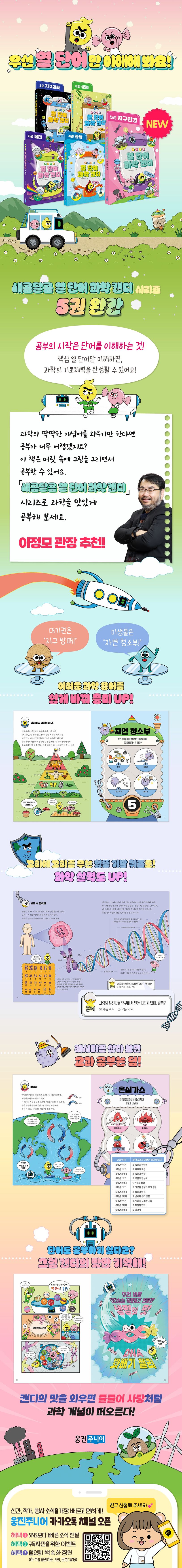 롤리폴리별은 아주 먼 외계에 있는 캔디 나라예요. 이곳에서 과학(science) 캔디 싸이(sci)와 언스(ence)가 태어났어요. 하지만 싸이와 언스는 맛을 갖고 있지 않았어요. 맛을 갖기 위해서는 ‘열 단어’만 찾아 이해하면 된다고 해요! 그래서 무엇으로든 변신할 수 있는 에그로봇의 도움을 받아 지구로 향합니다. 『새콤달콤 열 단어 과학 캔디』는 싸이와 언스가 지구를 탐험하며, 핵심 단어를 찾아 과학의 신비를 알아 가는 과정을 담았어요.