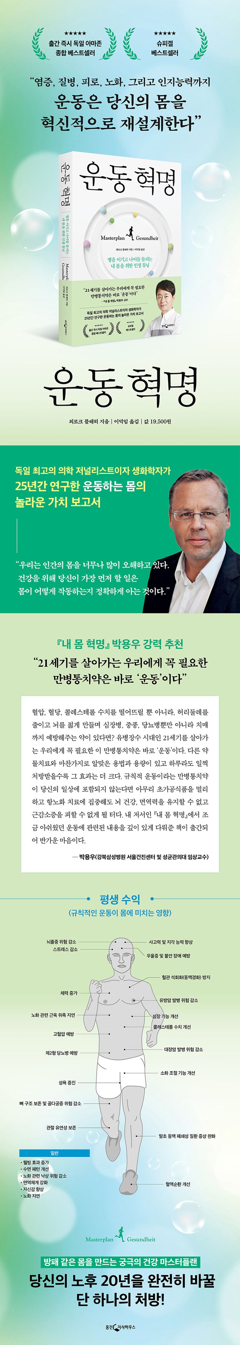 우리가 아는 것보다 운동은 인간의 몸을, 한 사람의 인생을 혁명적으로 바꿀 수 있다. 하물며 운동으로 매년 해마의 부피를 2% 이상 늘릴 수 있다면 믿겠는가. 운동이 몸의 메커니즘에 획기적으로 작용해 각종 질병과 노화를 막고, 건강한 삶을 영위하는 데에 어떻게 기능하는지 일깨우는 이 책은 매번 꺾이고 마는 당신의 운동 욕구를 다시 불타오르게 하는 것을 넘어 인생마저 활력 넘치게 바꾸는, 가이드북 이상의 역할을 할 것이다. 이제 더는 당신의 몸이 당신의 인생을 가로막는 일은 없어야 하지 않겠는가.