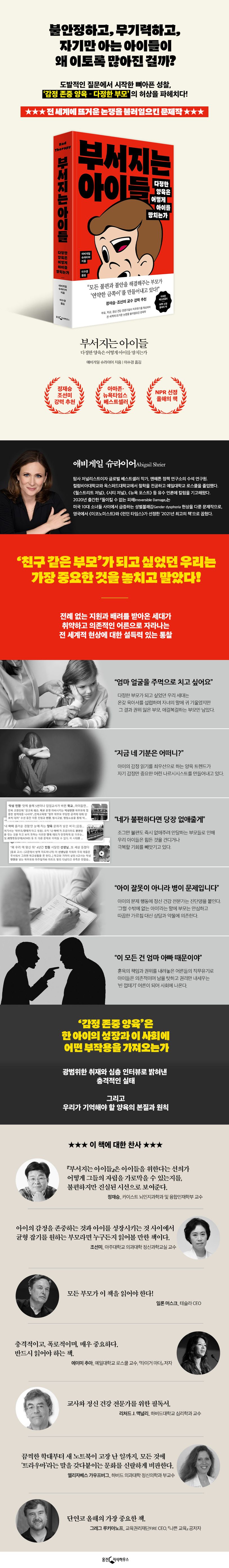 『부서지는 아이들』은 이 시대의 표준 양육 방식으로 자리 잡은 ‘감정 존중 양육’과 ‘다정한 부모’라는 환상이 아이들의 성장 과정은 물론, 사회 전반에 어떤 부작용을 가져왔는지를 적나라하게 폭로한다. 양육 주도권이 부모에게서 전문가에게로 ‘외주화’된 세태를 파헤치며 단호한 훈육 대신 심리 치료와 약물 치료가 남용되는 현실을 고발하고, 한 명의 단단한 인간을 길러내기 위한 양육의 본질과 원칙을 예리하게 짚어낸다. 수많은 영미권 석학과 인플루언서들의 극찬을 받은 이 책은 부모들의 뼈아픈 성찰을 불러일으키며 전 세계에 뜨거운 논쟁을 불러일으켰고, 아마존과 뉴욕타임스 베스트셀러를 비롯해 미국공영라디오(NPR)가 뽑은 ‘2024 올해의 책’에 선정된 바 있다.