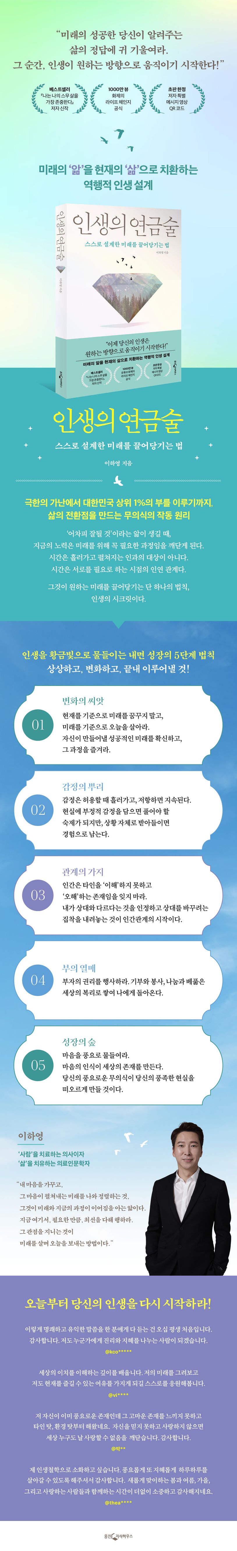 삶의 변화는 무엇에서부터 시작될까? 저자에 따르면 인생을 성공으로 이끄는 원천은 ‘미래에 대한 앎’이다. 그 앎은 단순한 희망이나 예측이 아니라, 이미 이루어진 미래를 무의식적으로 확신하고 살아가는 깊은 내면의 상태다. 『인생의 연금술』은 ‘변화, 감정, 관계, 부, 성장’이라는 다섯 가지 키워드를 통해 삶을 원하는 방향으로 이끄는 무의식의 작동 원리를 쉽고 상세하게 풀어낸다. 자신이 만들어낼 성공적인 미래를 발견하고 확신하는 방법부터, 부정적 감정을 긍정적 경험으로 변화시키는 법, 세상의 복리를 쌓는 부의 사용법 등 인생을 성공과 풍요로 이끄는 내면 성장의 5단계 원리를 들려준다. 막연한 희망을 넘어서 확신의 삶으로 나아가고자 하는 모든 이들에게 이 책은 가장 현실적이고 강력한 안내서가 되어줄 것이다.