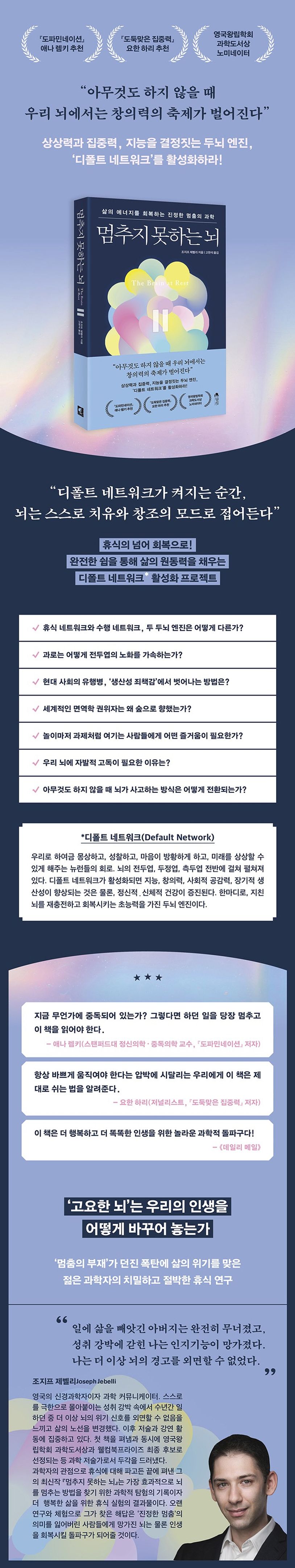 “디폴트네트워크가켜지는순간,뇌는스스로치유와창조의모드로접어든다”‘멈춤의부재’가던진폭탄에삶의위기를맞은젊은과학자의치밀하고절박한휴식연구평소와같이연구실책상앞에앉아있던신경과학자조지프제벨리는마침내인정할수밖에없었다.자신의뇌는망가졌고,계속해서망가지고있었다.스스로를극한으로몰아붙이는성취강박속에서수년간쉬지않고달려온결과였다.기억력과집중력,인지기능이점점떨어졌고신체적으로도타격받고있었다.제벨리는아버지를떠올렸다.20년간최선을다해일‘만’한아버지는“이제는어떻게쉬어야하는지도모르겠어!”라는절규와함께하루아침에무너져버렸고,10여년이지나도록회복하지못한채우울증과과다수면증에잠식되어있다.더이상뇌가보내는위기신호를외면할수없었다.그런데일을줄이고휴식을늘리자생각지도못한변화가일어났다.단순히피로를떨쳐내고건강을되찾는데그치지않고,오히려더생산적으로일할수있게된것이다.창의력과문제해결능력이스스로느낄수있을만큼향상되었으며,그어느때보다삶의에너지가충만해졌다.제벨리는과학자로서이현상에관해파고들기시작했다.우리가쉴때뇌에서는어떤일이벌어질까?그것이우리의삶에는어떤영향을줄까?더효과적으로쉬기위한방법은없을까?그해답을두뇌속‘디폴트네트워크’에서찾았다.완전한쉼을통해삶의원동력을채우는디폴트네트워크활성화프로젝트인간두뇌속에는서로다른역할을하는두가지엔진이존재한다.하나는목표지향적으로과제를수행해내는집행네트워크,다른하나는자유롭게창의력을발휘하는디폴트네트워크다.이들은뇌의여러영역에걸쳐분포하는뉴런들의회로로,시냅스를연결하고억제하는방식으로기능한다.이두엔진이균형을이루며가동되어야우리뇌는건강하게자신의능력을발휘할수있다.하지만더많이,더열렬하게일하는것을덕목으로삼는현대인들의뇌가조화롭게굴러가고있을리없다.중요한것은집행네트워크가켜지면디폴트네트워크는꺼진다는사실이다.종일쉬지않고단기적인성과에몰두하는동안우리는뇌를매우제한적으로사용하게된다.흔히‘휴식’이라고부르는활동,이를테면스마트폰을보거나사람들과수다를떨거나심지어잠을자는중에도디폴트네트워크가아닌집행네트워크가작동한다.그렇다면도대체디폴트네트워크는언제켜질까?제벨리는디폴트네트워크를활성화하는‘진정한멈춤’에주목한다.‘고요한뇌’는어떻게인생을바꾸는가가장효과적으로뇌를멈추기위한과학적탐험!제벨리는일과휴식을다룬무수한연구들을탐구하고분석하는것은물론,스스로실험대상이되는일도마다하지않았다.마음을자유롭게방황시키기위해내면경험을관찰하고표현하는‘묘사적경험표집법’실험에참여한이야기는마치흥미로운여행담처럼독자를디폴트네트워크의세계로이끈다.또한그는진정한멈춤에관해이야기해줄수있는사람이라면그게누구든,어디에살든찾아가묻고들었다.디폴트네트워크를최초로발견한신경과학계의권위자부터숲으로향한세계적인면역학자,완전한고독을선사하는무향실(anechoicchamber)의음향기술자,굳이자전거로출퇴근하는생물학자,네덜란드의휴식기법‘닉센(niksen)’을실천하는작가까지.제벨리는그들의이야기를수집하며두뇌속휴식엔진에대해더욱깊이알아낸다.나아가디폴트네트워크를작동시키는방법들을직접실천하느라고군분투하기도한다.『멈추지못하는뇌』는가장효과적으로뇌를멈추는방법을찾기위한과학적탐험의기록이자더행복한삶을위한휴식실험의결과물이다.우리뇌를잘쉬게할때,디폴트네트워크가제대로작동할때우리의인생은얼마나윤택하고건강해질수있는가.이책은놀이와휴식마저일처럼계획하고수행하느라‘진정한멈춤’의의미를잃어버린사람들에게망가진뇌는물론인생을회복시킬돌파구가되어줄것이다.추천의글“항상바쁘게움직여야한다는압박에시달리는우리에게이책은제대로쉬는법을알려준다.”-요한하리(저널리스트,『도둑맞은집중력』저자)“지금무언가에중독되어있는가?그렇다면하던일을당장멈추고이책을읽어야한다.”-애나렘키(스탠퍼드대정신의학·중독의학교수,『도파민네이션』저자)“더행복하고더똑똑한인생을위한놀라운과학적돌파구”-《데일리메일》