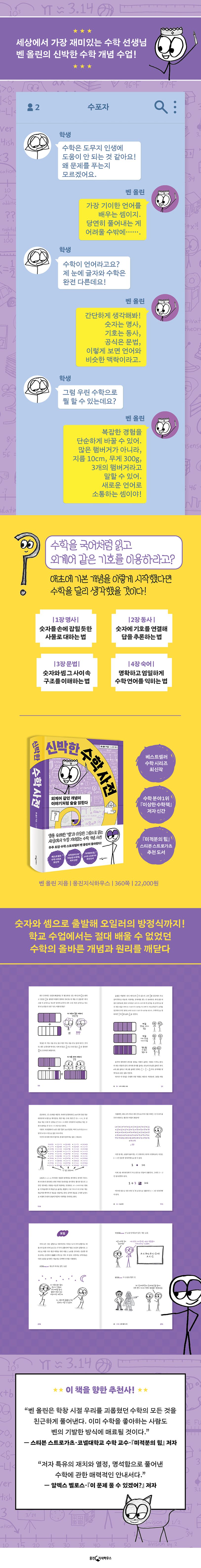 수학과 친해지고 싶다면 어떻게 해야 할까? 답은 의외로 간단하다. 차근차근 개념부터 배우고 그 원리를 익히는 것이다. 여기 세상에서 가장 쉽고 유쾌하게 수학을 알려주는 친절한 선생님이 있다. 바로 전 세계 베스트셀러 『이상한 수학책』의 저자 벤 올린이다. 자기만의 수학 ‘썰’에 특유의 유머를 더하고, 익살맞은 그림을 뒤섞은 벤 올린의 글은 기초가 약한 수포자는 물론 문제 풀이를 막막해하는 문과생까지 단숨에 사로잡았다.